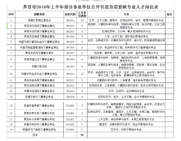 界首市部分事业单位2018年公开引进急需紧缺专业人才公告为补充我市部分事业单位急需紧缺专业技术人才,加强人才队伍建设,根据《安徽省事业单位公开招聘人员暂行办法》《关于进一步做好艰苦边远地区县乡事业单位